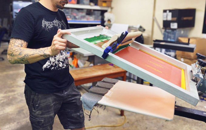 If you’re not set up to screen print on heat transfer paper there are websites you can send your design to and they will mail you screen printed transfer paper with your design printed on it, Keep in mind, to print on masks using this method you’ll need a heat press and transfer adhesion powder. Here’s a how-to video.